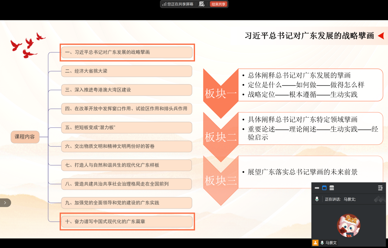 会议伊始,马景文主任对各位授课教师在全新课程备课过程中的辛勤付出表达了诚挚感谢。她指出,这门课程意义重大,是引导学生深入了解广东发展、感悟时代脉搏的重要窗口,大家的努力为课程顺利开展奠定了坚实基础。