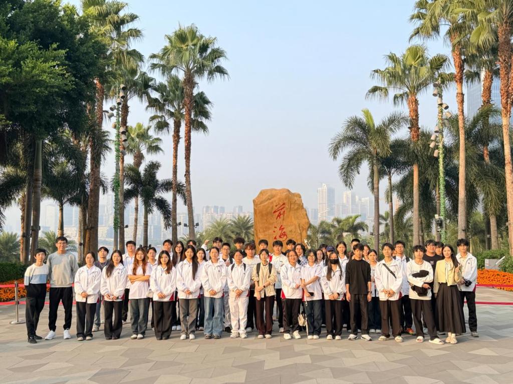 最后,调研队伍来到前海石公园。这块镌刻着“前海”二字的巨石,见证了这片滩涂如何崛起为国际化城市新中心。十年前这里还是一片荒滩,如今已吸引全球300余家世界500强企业落户。前海的蜕变印证了“改革开放是决定当代中国命运的关键一招”,它从无到有、从小到大的发展历程,是中国改革开放伟大实践的生动缩影。同学们沿着观景长廊游览,海风拂过青春的面庞,远处是连绵起伏的现代化高楼大厦。大家被眼前的现代化景象所触动,直观感受到了这片“特区中的特区”的巨大变化。