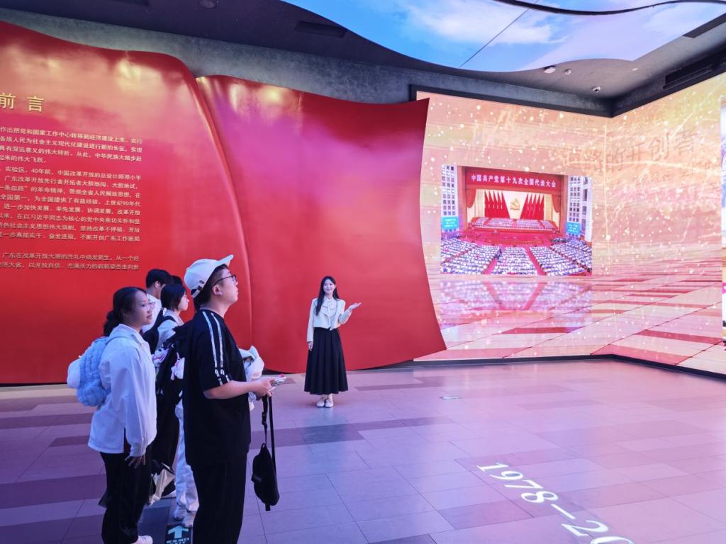 紧接着,师生来到“潮起珠江·改革开放展览馆”,历史的气息扑面而来。马景文老师以“时间轴”为线索,从“杀出一条血路”的破局之举,到“闯出一条新路”的制度创新,系统梳理了广东作为改革开放“试验田”的历史贡献。同学们围在展柜前,透过老式计算器、手写账本等物件,想象着当年创业者们在简陋条件下拼搏的场景。当听到“广东连续多年GDP占全国总量超十分之一”的数据时,展厅内的气氛瞬间热烈起来,同学们的脸上纷纷露出惊讶与自豪的神情,有的同学还忍不住轻轻鼓掌,为广东取得的辉煌成就喝彩。