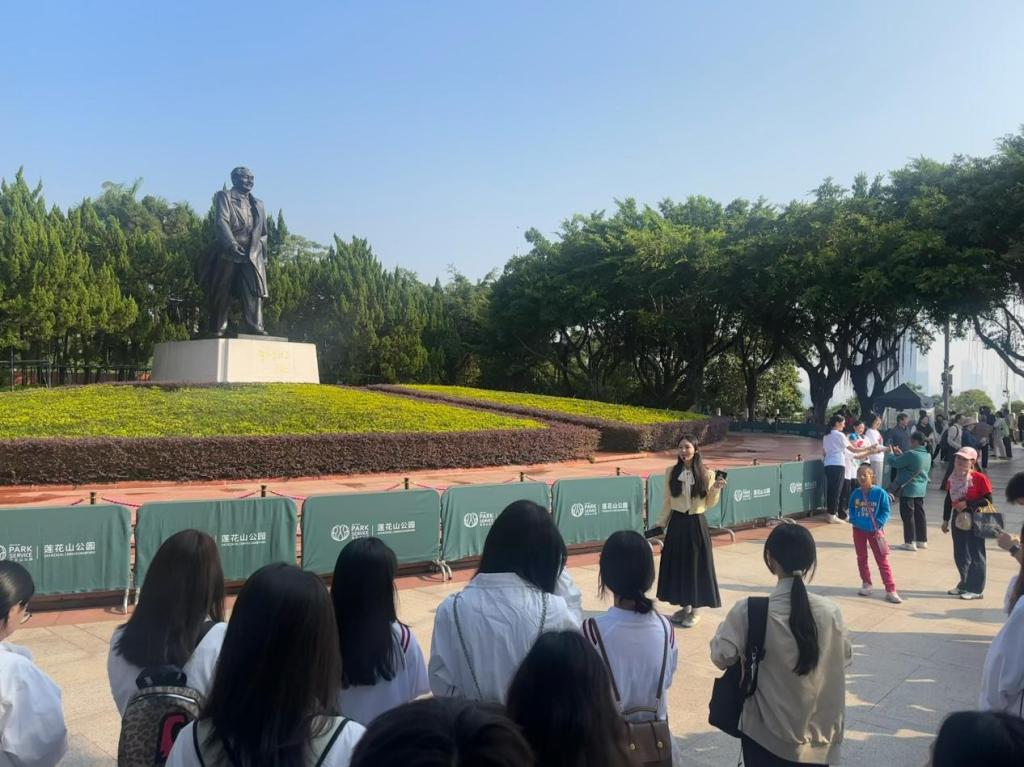 首先,调研首站抵达莲花山公园,邓小平同志铜像在苍松翠柏间巍然矗立。师生们缓步上前,在铜像前驻足瞻仰。马景文老师以“春天的故事”为引,深情讲述这座公园如何从普通山丘蜕变为改革开放的精神地标:“1992年邓小平同志南巡时,曾在此眺望深圳建设图景,这座铜像不仅是对伟人的缅怀,更象征着中国改革开放的坚定方向。”同学们凝视铜像,神情肃穆,远处现代化的城市天际线与铜像的厚重历史感形成鲜明对比。医学技术学院的张瑞君同学感叹:“站在这里,我仿佛能触摸到改革开放的脉搏,感受到一代代建设者敢为人先的勇气。”