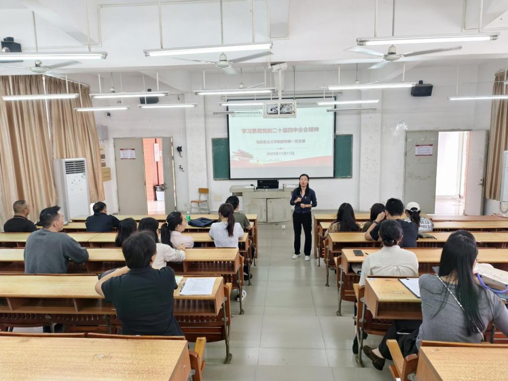 2025年11月11日,马克思主义学院教师第一党支部在博学楼B401教室召开专题学习会,深入学习贯彻党的二十届四中全会精神。会议由第一党支部书记邓秀芬老师主持,全体党员教师参会。